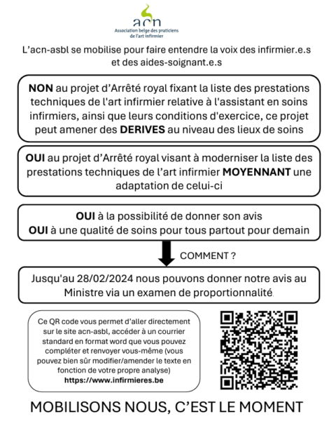 NON au projet d’Arrêté royal fixant la liste des prestations techniques de l’art infirmier relative à l’assistant en soins infirmiers, ainsi que leurs conditions d’exercice, ce projet peut amener des DERIVES au niveau des lieux de soins